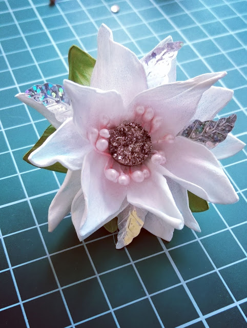 Na koniec między płatkami przykleiłam klejem na gorąco kilka srebrnych cekinowych płatków, a między pręcikami kryształka.